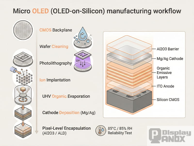 A silicon-based Micro OLED can be understood as a precision “layer cake” built on top of a silicon wafer: