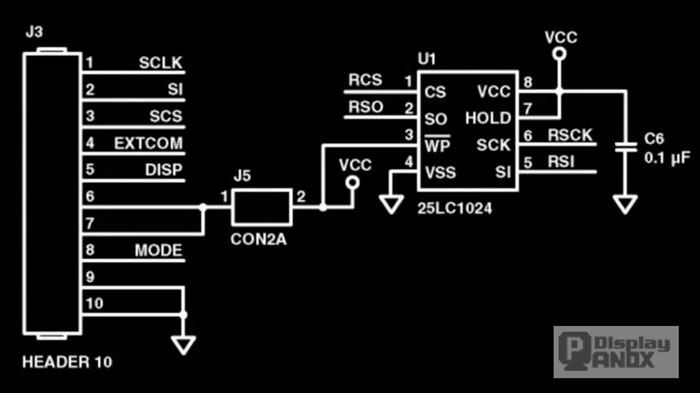 This LCD uses a three-wire interface specifically the spy bus which has basically a data clock in a chip select. This is a very simple interface which is very common in the industry, most embedded processors had that built-in already. This gives memory LCD a great advantage in that the engineer doesn`t need any external devices which really helps low power consumption.